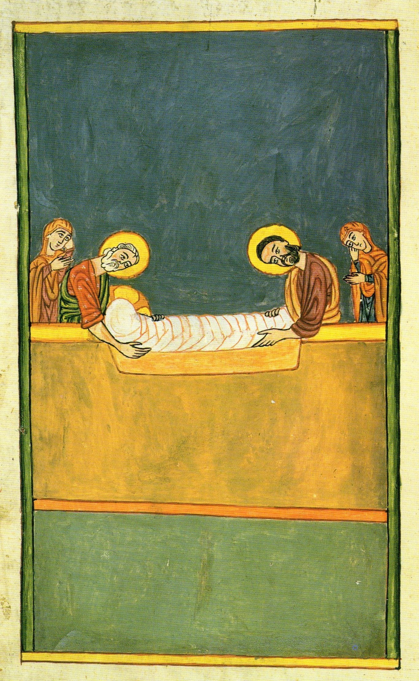 The Entombment painting above is from a fifteenth-century book that’s been copied and illuminated at the Monastery of St. George in Armenia. Christ’s body lies at the center, with His head tilted toward the viewer but wrapped, like the rest of him. Joseph of Arimathea cradles His head, and Nicodemus straightens his legs. Two of the Marys stand by, grieving. The dark blue above indicates the deep darkness of the cave. It represents emptiness and loss.