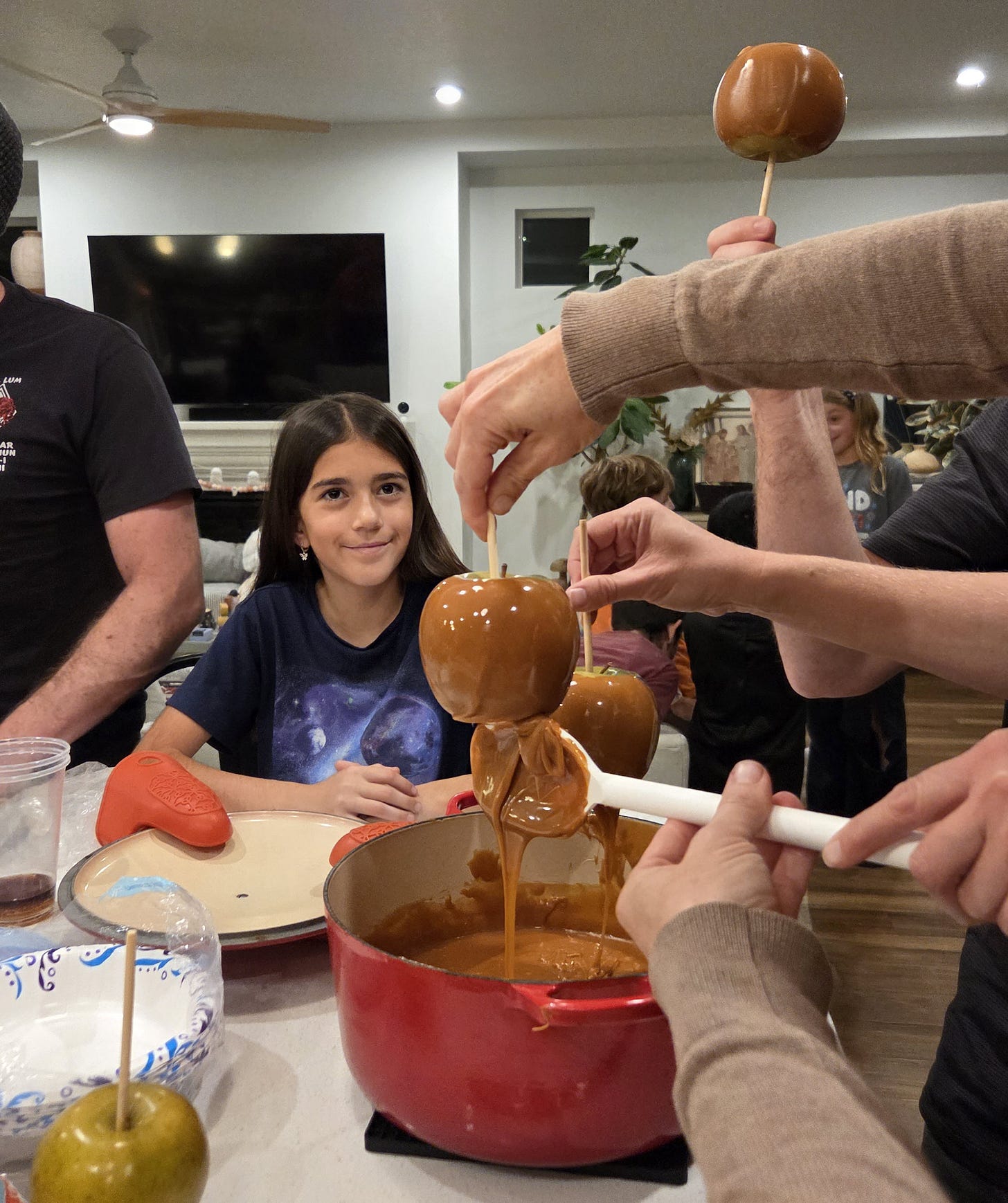 Greet old college buddies gathered for caramel apple making.